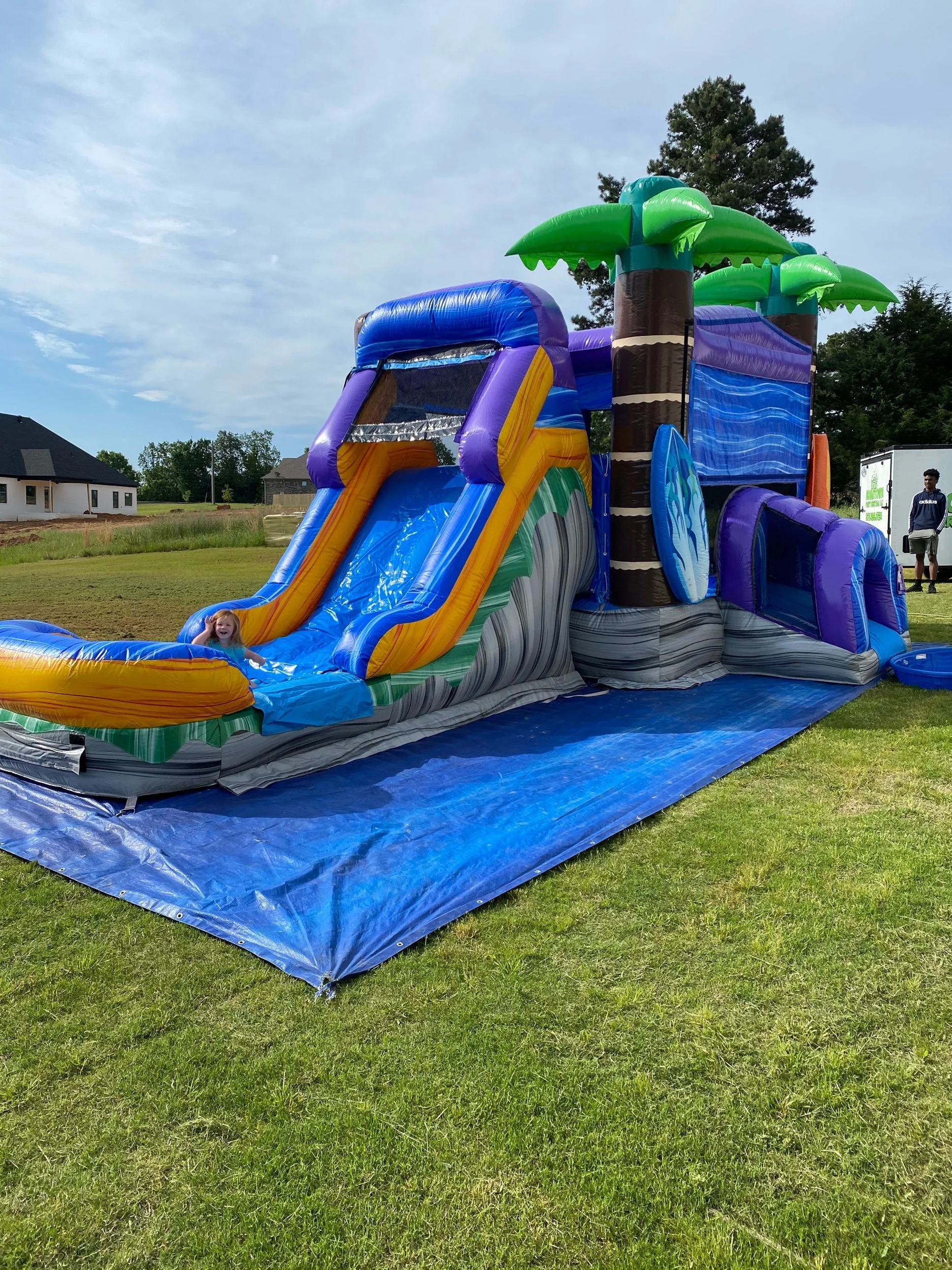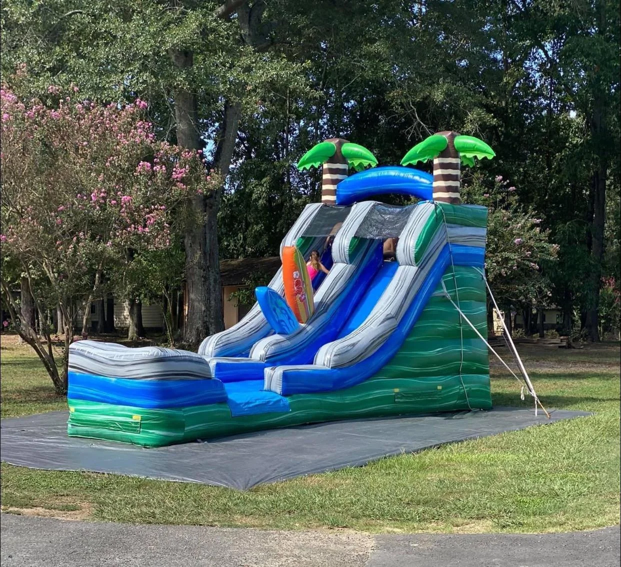 This slide is 26ft tall 15ft wide and 30ft long, along with a fast slide there is a 250 gallon pool that you go zooming into for a big splash!