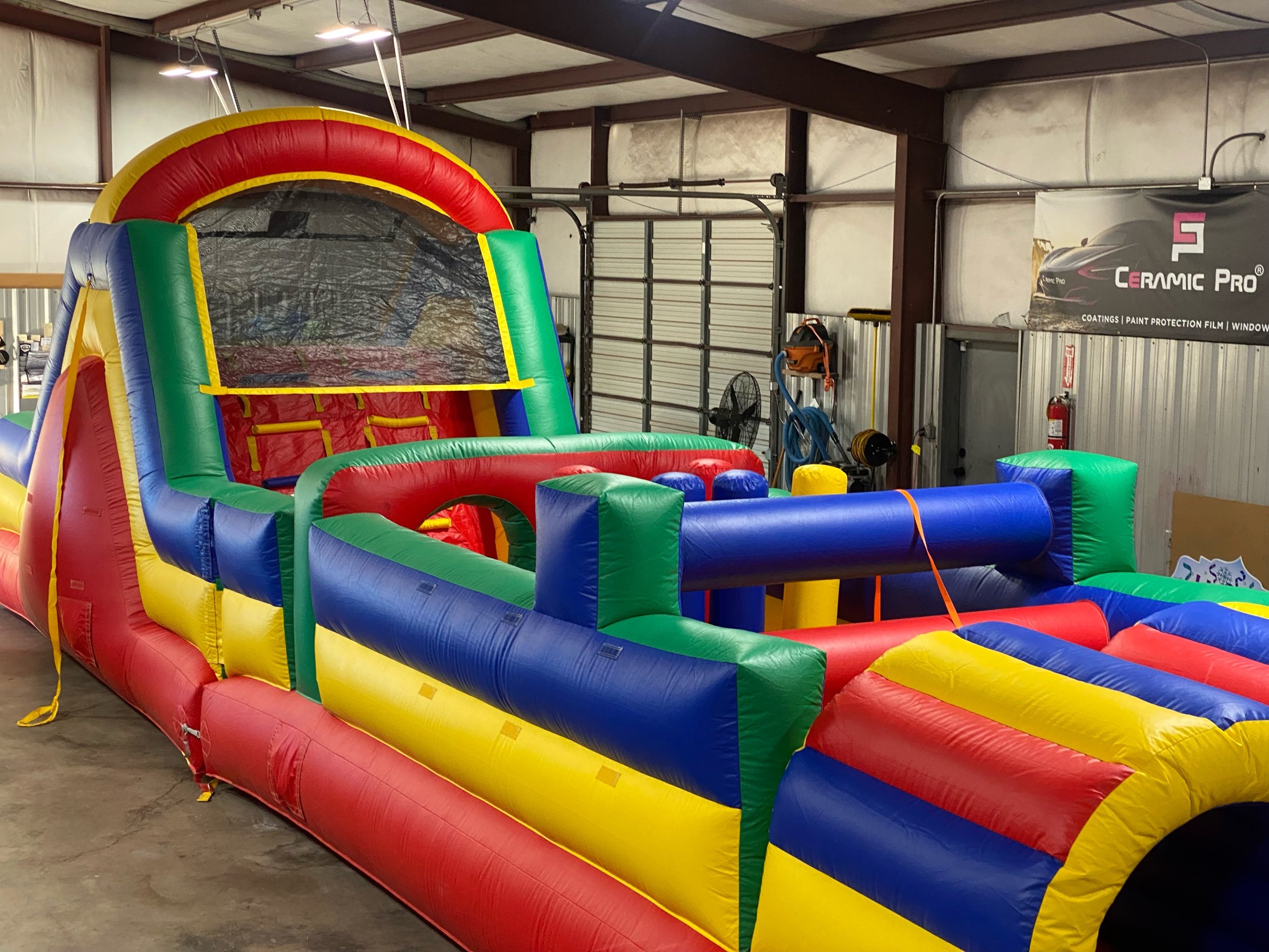 This unit is the one to burn off all of that energy! 38 ft of fun run through the bumpers, climb the small wall and slide out the other slide!